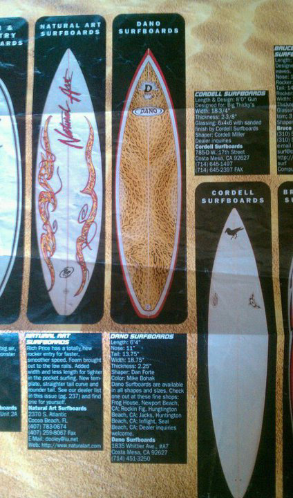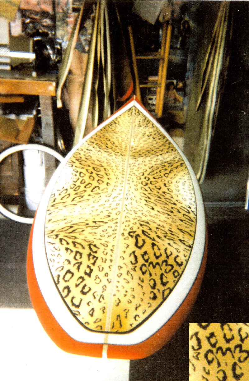 I airbrushed this surfboard for Dano surfboards in the mid 90's. Leopard skin with red rail ban and black pinlines. I used water based paint on the colors and laquer on the pins. India ink was used on the leopard spots.